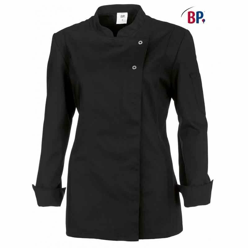 Diese taillierte Damen Kochjacke von BP 1544 ist für Industriewäsche geeignet dadurch können auch tiefe Flecken entfernt werden. Sie besitzt einen Stehkragen sowie Ärmel mit Manschetten. Diese Damenkochjacke in schwarz überzeugt auf Anhieb durch ihren edlen Schnitt, durchdachte Details und ihre hochwertige Verarbeitung. So genügt die Damenkochjacke in schwarz selbst höchsten Qualitätsansprüchen. Der durchdachte Materialmix, die elegante Schnittführung und die exklusive Verarbeitung spiegeln sich in den geradlinigen dezenten Formen der Damenkochjacke in schwarz wider. Der leicht taillierte Schnitt, die langen Ärmel mit Manschetten und der markante Stehkragen betonen die Eleganz der Damenkochjacke in schwarz. Ein besonderer Hingucker sind die verdeckten Edelstahldruckknöpfe, zwei davon sind als Schmuckelement sichtbar an der Damenkochjacke in schwarz angebracht. Geschickt platzierte Belüftungsöffnungen sorgen dafür, dass Sie im hitzigen Küchenalltag in Ihrer Damenkochjacke in schwarz cool bleiben.