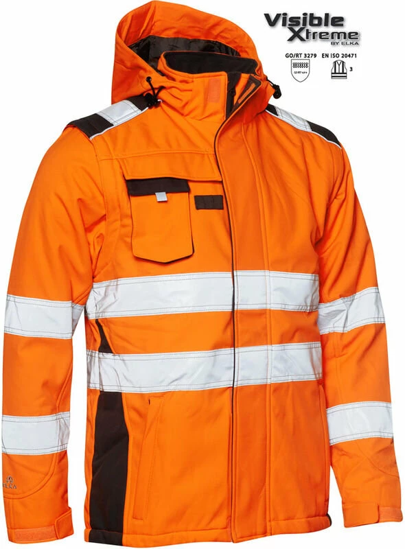 wasserabweisende, winddichte als auch warme und hochmoderne Elka Warnschutz Softshell Jacke 116514R. Diese Jacke bietet Ihnen dank ihres warem Thermofutters auch an kalten tagen besten Schutz und ist besonders geeignet für den Winter. Diese Jacke kann man sowohl als Weste tragen das sie abnehmbare Ärmel hat. Des weiteren ist die Kapuze dieser Jacke abnehmbar.